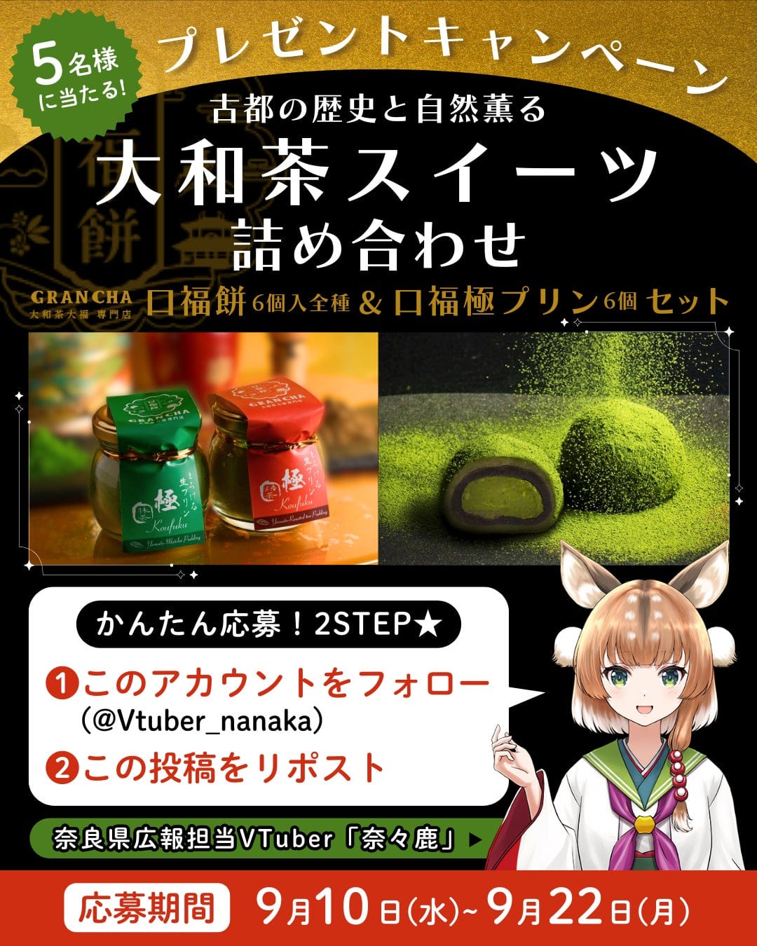 今回のキャンペーンでは、奈良県名産の大和茶を使用したスイーツ詰め合わせを抽選で5名にプレゼントします。応募期間は2025年9月10日から9月22日までで、奈々鹿公式Xアカウント(@Vtuber_nanaka)をフォローし、キャンペーン投稿をリポストすることで応募可能です。